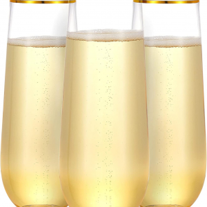 36 Pack Plastic Champagne Flutes, 9 Oz Stemless Disposable Gold Rim Toasting Glasses, Crystal Clear Cocktail Cups Drinkware Shatterproof Ideal for Party Wedding Birthday