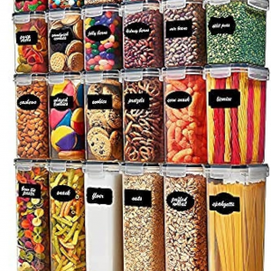 24 Pack Airtight Food Storage Container Set – BPA Free Clear Plastic Kitchen and Pantry Organization Canisters with Durable Lids for Cereal, Dry Food Flour & Sugar – Labels, Marker & Spoon Set
