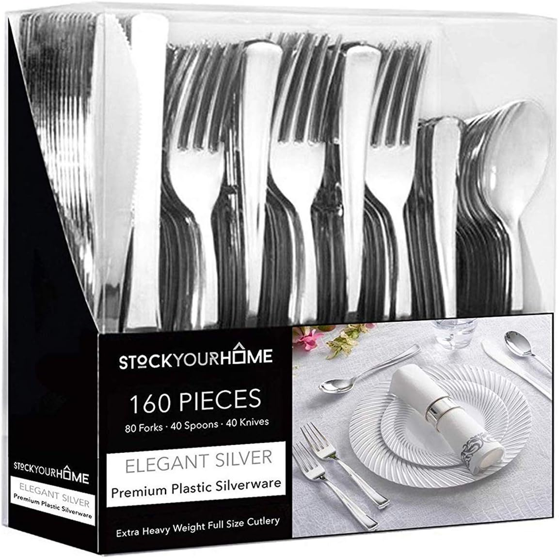 - GREAT VALUE PACK: With 80 forks, 40 knives and 40 spoons, you’ll have more than enough to supply for a large gathering and to save up for your next big event. Great value for the price in addition with its heavy weight and durability. Measurements: Fork: 7.35″L, Knife: 7.9″L, Spoon: 7.0″L.
