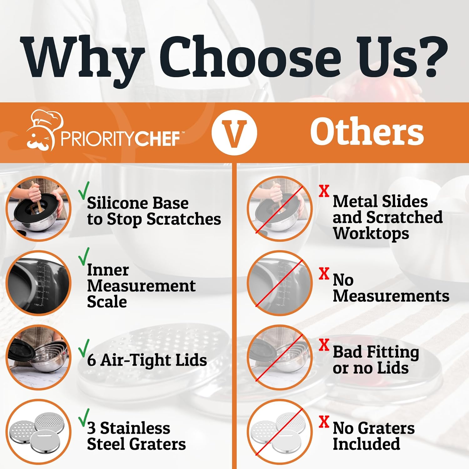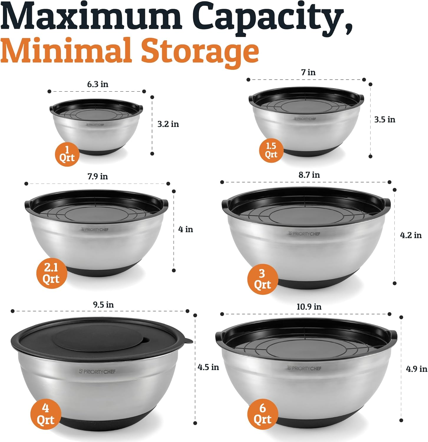 • A Bowl Size For Every Occasion: Baking and cooking prep is a breeze withy our complete set of 6 stainless steel mixing bowls with lids set, ranging in size from 1 to 6 quarts. Whatever the task you’ll find the perfect size in this steel bowl set.