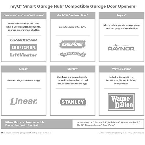 Details: myQ Smart Garage Hub by Chamberlain allows you to use your smartphone to open and close your garage door from anywhere. Feel more secure at home when you set times for your garage to close and receive alerts when the garage door opens and closes. With the myQ garage, your smartphone, Wi Fi and any compatible garage door opener, you are connected and in control. myQ is compatible with most brands of garage door openers made after 1993, including Chamberlain, Craftsman, Lift Master, Stanley, and more. Note: You must have a sectional garage door and safety sensors installed. myQ is easily installed in four steps or you have the option to request expert garage hub installation for added support. myQ also works with Google Assistant for voice control, IFTTT, and Wink for even more features and functionality. Daily schedules preset times for your garage door to close or your lights to turn on/off every day. Enhanced security and protection with so many connected devices protecting your data is more important than ever.