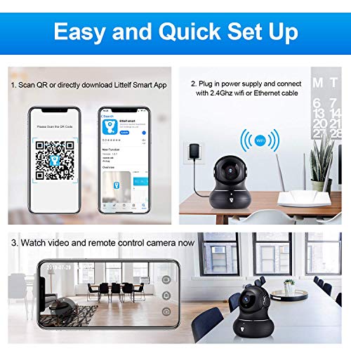 - 【1080P Full HD & Smart Pan/Tilt Indoor Camera】Please download “littlelf smart” app not “littlelf” app. 1920*1080 Mega Pixels and high-tech optic lens present sharper details and produce crystal clear image quality. Support reliable Ethernet cable and 2.4G Wi-Fi connectivity (Not compatible with 5G), This wifi camera provides wider viewing angle with horizontal 355° and vertical 110° function for complete coverage of your home, no blind spot.
