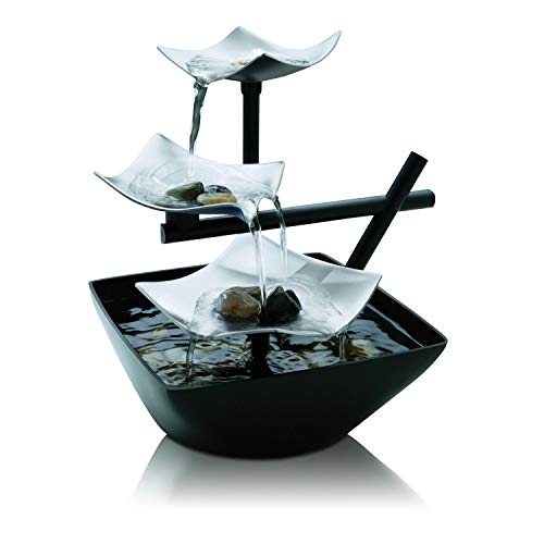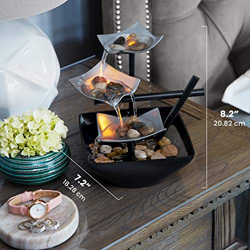 - Innovative Artistic Design : This Asian inspired Fountain Features 3 tiered leaves that water streams down; Its extra deep, open styled basin allows for the serene Sounds of cascading Waters to fill Your Home; It was Designed with a Unique Lighting feature that creates a Soft reflection of the natural flow of Fresh running Water; The illuminating glow creates a romantic ambiance; Add the natural river rocks to any of the 3 tiers, or into the basin