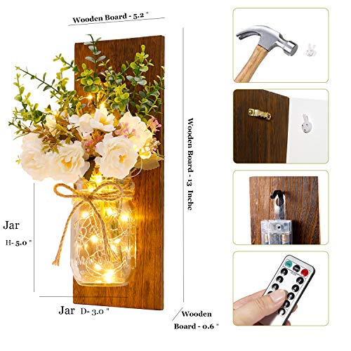 Details: You are still thinking about how to add rustic wall decor furniture at the farmhouse? Or need a special gift? Our mason jar wall sconce may be your best choice. ✩ The vintage romantic of the farmhouse inspires the original intention of our design. In the tranquil, rustic home, you need a shabby chic mason jar lights decor, Add a retro touch to your country cottage. You can hang it on one side of the small courtyard, Enjoy the warm light. When you go home at night; It will guide you in the direction of going back. ✩ We choose the best quality materials handcraft; You can enjoy the handmade DIY process. You can also customize the jars with real flowers like roses, carnation, or jasmine, candles, and much more. ✩ What’s In The Box? – 2 x mason jars (Diameter 3” Height 5”-16oz ) – 2 x wooden boards (13”x5.2”x0.6”) – 2 x silk hydrangeas – 2 x polyethylene grass – 2 x Led strip Timer lights – 2 x 8 modes remote control