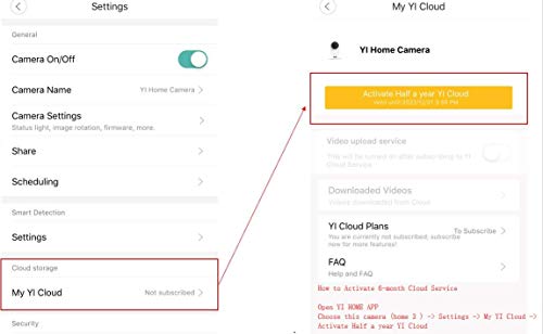 - How to Activate 6-month Cloud Service: Open YI HOME APP, choose this camera / Settings / My YI Cloud / Activate Half a year YI Cloud.